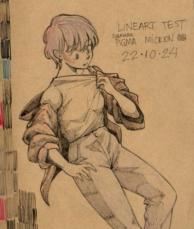 Para canetas (brush pen) com cerdas, teste fazer um traço grosso antes de fazer os traços finos. O traço grosso fará com que as cerdas “se abram/espalhem” (tipo um “mini leque”). Isso também me ajudou a obter linhas bem fininhas!🤭